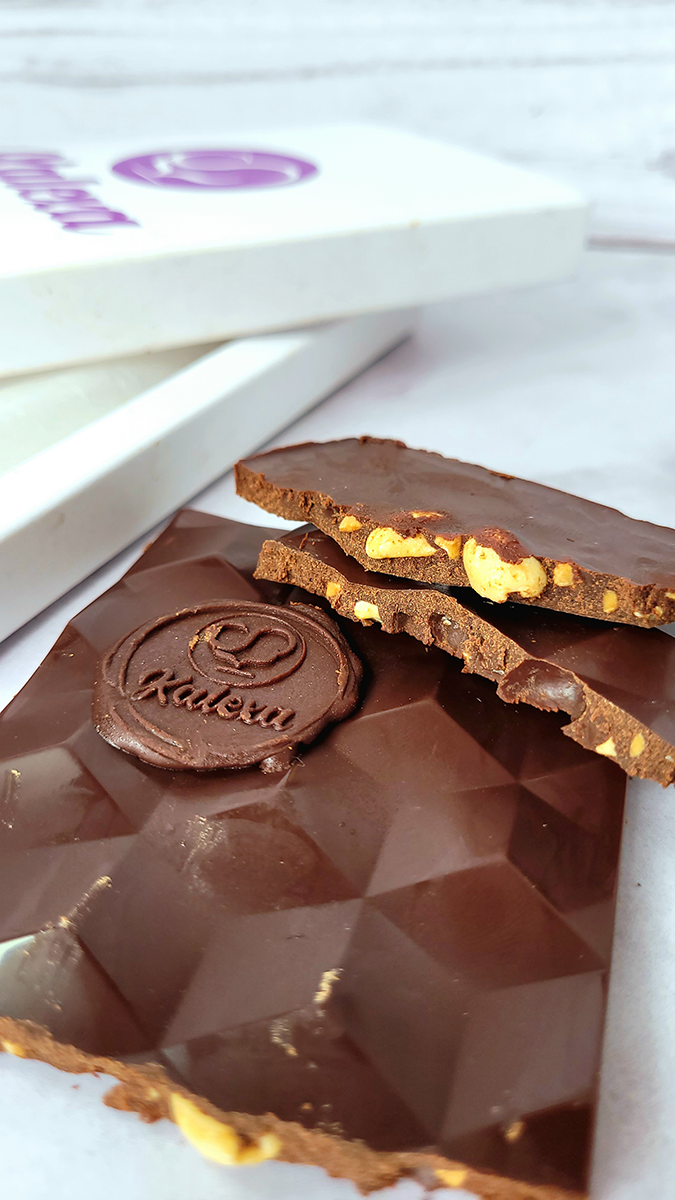 Krokán es nuestra Barra de chocolate al 80%, sin azúcar, endulzada con alulosa y stevia con trocitos de maní natural.